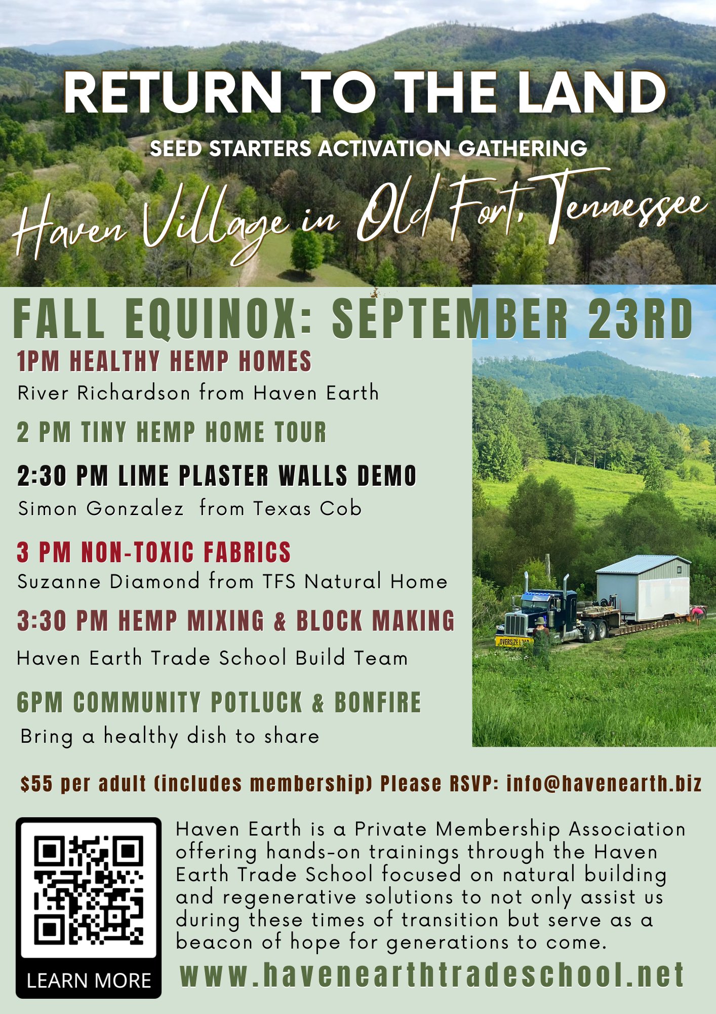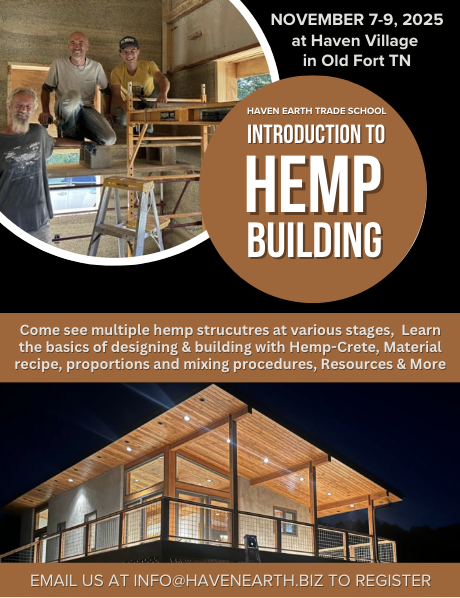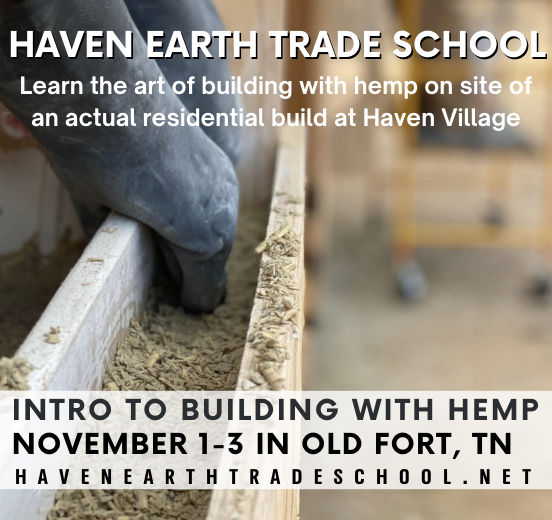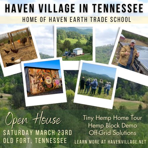 Would love for any of our Tennessee Neighbors & Friends to join us for a very special Equinox Gathering on September 23rd. Our first Haven Earth Trade School Event to officially activate the land with our intentions, dreams and visions! Come tour our Tiny Hemp Home, Make Your Own Hemp Block, Learn About Natural Lime Plasters with Simon from Texas Cob & More!